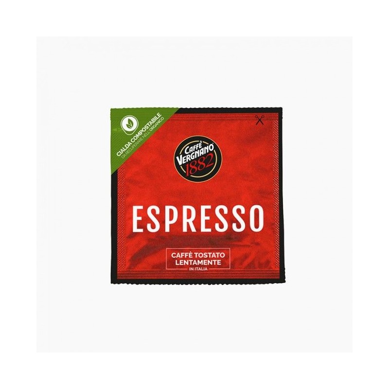 Vergnano Caffè Espresso u ESE vrećicama od 44 mm za kompostiranje mješavina je dobivena od visokokvalitetnih sirovina, a njezina je karakteristika snažan i odlučan okus.